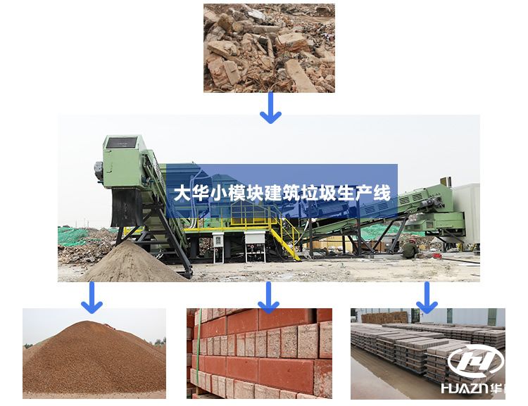 隨著城市建設的發展,廢棄物的拆遷過程中產生不少的建筑垃圾,這些建筑垃圾包括工程渣土、拆遷垃圾、工程水泥漿、碎石塊、泥漿、瀝青塊等,數量與日俱增,不僅污染環境,而且占用土地面積。洛陽大華重機的小模塊建筑垃圾生產線,是經過破碎、分選、篩分流程后,最后將其消化為不同粒徑的砂石再生骨料,這種生產線每小時可吃掉建筑垃圾80多噸,消化后的建筑垃圾可用于各類混凝土砌塊、地面磚,可實現綠色環保建筑垃圾再生循環鏈。