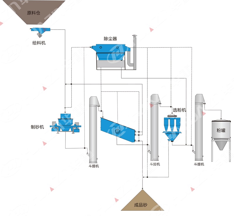 該系統主要用于生產預拌砂漿用細砂,設計產量為50t/h,原料為-30mm以下的碎石,成品砂細度模數2.4-3.0之間可調整,石粉含量控制在5%-15%,系統配置的核心主機設備為洛陽大華生產的PLS1000專用精品制砂機1臺,該設備成品粒形好,粒度穩定,設備使用成本低,維修保養簡單。其它配套主機還有多層細粒篩分機1臺,高效選粉機1套,環保除塵設備1套,斗式提升機3套,粉料罐1套及其它相關計量和輸送設備等。