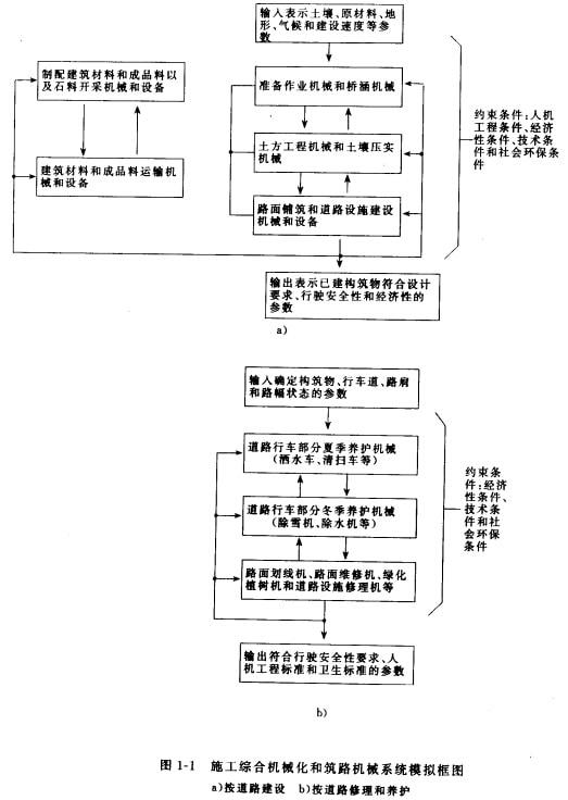 筑路機械由許多主要子系統組成(圖1-1d):工藝于系統(工作機構和行走裝置);動力子系統(發動機);操縱和生命保障于系統以及操作人員子系統。筑路機械主要特殊的標志是具有可以周期作業和連續作業的專用工作機構。為了布置工作機構,筑路機械應具有原結構的機架。為此,廣泛應用載重汽車和拖拉機的標準底盤或輪式牽引車。路面鋪筑作用的綜合機械化和自動化是基丁多種通用建筑機器和專用筑路機械合理的組合。