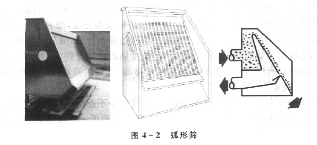 弧形篩(圖4—2)篩面呈弧形,待篩分物料制成料漿。料漿含水約為30%。 從弧形篩頂部結入。在篩面上,由于料漿受重力、離心力及篩條對料漿的阻力作 用,使料漿緊貼篩面流動。緊貼篩面的下層料漿運動速度低,細粒和液體從篩縫 中落入篩下,大顆粒從篩面末端排出。一般通過篩縫的顆粒尺寸為篩縫寬度的 1/4,所以這種篩不易發生堵塞,但篩分效率低。