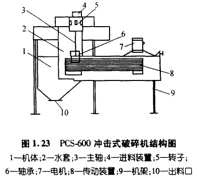 沖擊式破碎機的結構如圖1.23所示。電機通過三角皮帶驅動裝宜和轉子高速旋轉。從進料裝置進入的物料,通過轉子上部的給料管進入轉子,被分配錐均勻地分布在轉子的各個通道中,物料在通道內被加速,在極短時間內達到使物料足以破碎的速度,高速拋出的物料與機體內的襯板碰撞,形成第一破碎,隨后第一次破碎的物料又受到繼續拋出的物料的碰撞,形成物料與物料之間的多次碰撞,從而達到破碎物料的目的。