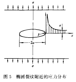 圖5表示一個橢圓裂紋附近的應力分布情況。從圖可見,在離孔遠處,應力分布受孔的干擾很小,基本上是均勻分布的。在長軸的兩端點上,有高度應力集中,而在短軸兩側,應力被卸除,形成低壓區。當橢圓的短軸長度衰減至零時,便是一條長度為2α√σπ的裂紋。當ρ≤α時,最大應力為: