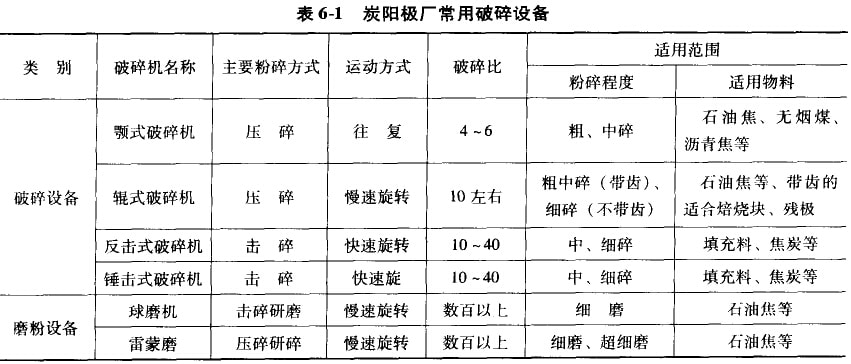 陽(yáng)極廠原料的破碎,一般分為3—4個(gè)級(jí)別:粗碎是將200mm左右的大塊破碎至50—70mm中塊;中碎是將50mm左右的小塊破碎至1—20mm的粒子;磨粉是將lmm左右的粒子磨到0.075mm左右的細(xì)粉。