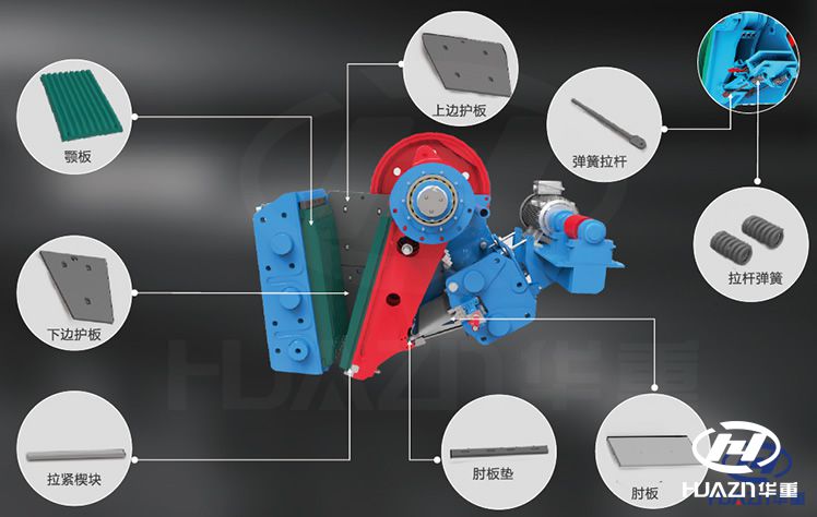 對于顎式破碎機來說其易損件主要有活動顎板、固定顎板、襯板、肘板、偏心軸和軸承等。在實際的生產過程中,易損件的非正常磨損除了與設備的結構缺陷有關,還與物料的硬度過大、物料的粒度過粗、設備潤滑效果不理想以及環境因素等有關。