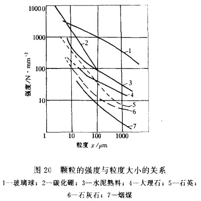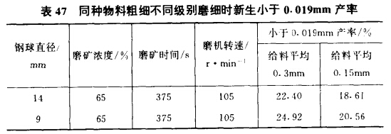 (2)礦石硬度的影響隨磨礦粒度的變細(xì)逐漸減弱,而產(chǎn)品細(xì)度的影響則逐漸增強(qiáng)。由于礦石力學(xué)性質(zhì)的不均勻性,同種礦石粒度愈粗的微裂縫愈多,機(jī)械強(qiáng)度愈差,愈易磨。而粒度愈細(xì)則機(jī)械強(qiáng)度愈好,愈難磨細(xì)。用3~0mm的石英及方解石(莫氏硬度分別為7及3)在同樣條件下進(jìn)行磨碎,使它們均磨到0.04mm占90%時(shí),硬的石英需要80mm,而軟的方解石只要50min,證明硬度對(duì)細(xì)磨效率的影響仍然存在。另外,又用同樣物料的兩個(gè)粗細(xì)級(jí)別在同樣條件下磨相同的時(shí)間,結(jié)果新生小于19μm顆粒產(chǎn)率是粗級(jí)別磨碎后產(chǎn)生的多,細(xì)級(jí)別產(chǎn)生的少(見表47所示),證明粒度愈細(xì)愈難磨。由表48軟硬兩種礦物細(xì)磨時(shí)細(xì)粒級(jí)增長情況又可以看到,當(dāng)對(duì)硬的石英及軟的方解石進(jìn)行細(xì)磨時(shí),產(chǎn)品磨得愈細(xì),新生細(xì)級(jí)別產(chǎn)率的差距愈小,證明磨'礦粒度愈細(xì),礦石硬度的影響逐漸減弱,而產(chǎn)品細(xì)度的影響逐漸增強(qiáng)。出現(xiàn)這種現(xiàn)象的原因,一方面是因?yàn)榱6茸兗?xì)之后,顆粒的宏觀和微觀裂紋減小,顆粒也較為均質(zhì),且缺陷減少,因此即使是軟礦物的強(qiáng)度也增強(qiáng)了,圖20即說明了此點(diǎn);另一方面是細(xì)磨時(shí)條件惡化,磨礦過程難以有效進(jìn)行,細(xì)磨時(shí)的破碎概率低。由此引起隨著磨礦粒度變細(xì)而導(dǎo)致的軟硬兩種礦物的磨細(xì)速度差減小。