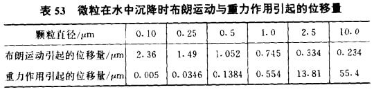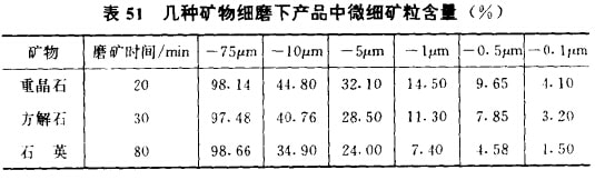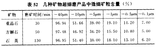 (6)礦石細(xì)磨下微細(xì)礦粒布朗運(yùn)動(dòng)影響顯著增強(qiáng)。用重晶石、 方解石、石英等三神礦物作細(xì)磨及超細(xì)磨試驗(yàn),結(jié)果發(fā)現(xiàn),細(xì)磨 下小于lμm的含量約7%~15%,超細(xì)磨下小于1μm的含量則高達(dá)15%~20%,見表51及表52所示。雖然膠體分散體系是指分散相大小在lμm到lnm之間的分散體系,但這樣的劃分范圍,并不是固定不變的。膠體分散體系具有明顯的布朗運(yùn)動(dòng)現(xiàn)象,但有資料指出,粒度稍大于的顆粒的布朗運(yùn)動(dòng)位移量已大于重力作用的位移量,情況如表53所示。細(xì)磨或超細(xì)磨下,粒度在以下的礦粒已達(dá)20%,即有1/5的礦粒接近布朗運(yùn)動(dòng)狀態(tài), 所以在研究細(xì)磨時(shí)就不能不考慮這種現(xiàn)象。