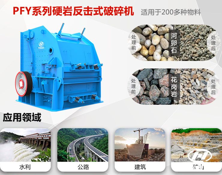 我公司的PFY系列高效液壓反擊式破碎機就是一款專門破碎硬巖的反擊破,該設備采用了重型化轉子體結構,大容量破碎腔,抗磨合金板錘,厚重耐沖擊的反擊襯板,和多點液壓調整和液壓開啟裝置,確保其擁有超強的破碎能力和破碎效果,進料粒度大,出料粒度更小更細,破碎比大,產品粒形好等特點。多用于加工抗壓強度大于300MPa,莫氏硬度大于6級的石料,如河卵石、花崗巖、玄武巖之類較硬物料。