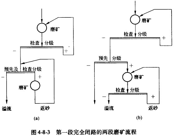 圖4-8-4中,流程(a)的每一礦粒只通過(guò)分級(jí)溢流堰一次,貿(mào)要的分級(jí)面不大,但卻難以得到較紉的最終產(chǎn)物。流程(b)中疆流經(jīng)過(guò)了控制分級(jí),能得到較紉的最終產(chǎn)物,但需要安裝大量的分級(jí)機(jī)。