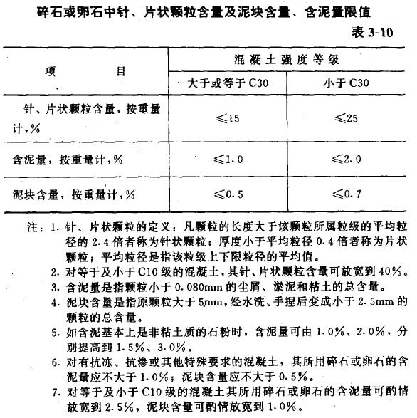 碎石或卵石中針片狀顆粒含量及泥塊含量、含泥量應符合表3-10的規(guī)定。