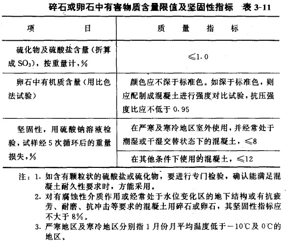 碎石或卵石的堅固性,硫化物和硫酸鹽含量以及卵石中有機雜質(zhì)含量應符合表3-11的規(guī)定。