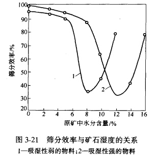 水分對(duì)某種物料的篩分過(guò)程的真體影響,只能根據(jù)試驗(yàn)結(jié)果判斷。篩分效率與物料濕度的 關(guān)系見(jiàn)圖3-21。由圖可知,水分對(duì)兩種物料的影響是不同的,其原因是這兩種物料具有不同的吸 濕性能。圖中曲線說(shuō)明,當(dāng)物料含水分達(dá)到某一范圍時(shí),篩分效率急劇降低。這個(gè)范圍取決于物料性質(zhì)和篩孔尺寸。當(dāng)物料所含水分超過(guò)這個(gè)范圍后,顆粒的活動(dòng)性重新提髙,物料的黏滯性反而消失。此時(shí),水分有促進(jìn)物料通過(guò)篩孔的作用,并逐漸達(dá)到濕法篩分的條件。這時(shí),物料和水一起進(jìn)行篩分。