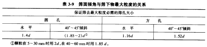 一般情況下,篩子是傾斜安裝的,以便于排出篩上物料。傾角大小要合適,傾角過(guò)小,物料在篩面上運(yùn)動(dòng)速度太慢,雖然篩分效率高,但篩子的生產(chǎn)率減。环粗,傾角太大,物料排出太快,篩分效率降低。當(dāng)篩面傾斜安裝時(shí),可以讓顆粒順利通過(guò)的篩孔尺寸只相當(dāng)于篩孔的水平投影,如圖3-22所示。能夠無(wú)阻礙地透過(guò)篩孔的顆粒直徑等于d = Icosa - hsina,式中I為篩孔尺寸,h為篩面厚度,a為篩子的傾角。由此可見(jiàn),篩面的傾角愈大, 使顆粒通過(guò)時(shí)受到的阻礙愈大。因此,篩面的傾角要適當(dāng)。表3-9所示為篩面的傾角與篩下物最大粒度及篩孔尺寸的關(guān)系。