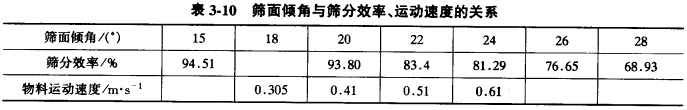 篩面傾角的大小直接影響物料在篩面上的運(yùn)動(dòng)速度和篩分效率,如表3-10所示。由此可見(jiàn),隨著振動(dòng)篩安裝傾角的增大,篩面上物料的運(yùn)動(dòng)速度明顯加快,同時(shí),篩分效率下降。