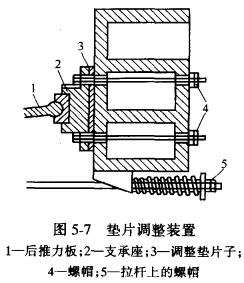 如圖5-7所示,在后推力板1的支承座2后面放人一組厚度相同的墊片3,改變墊片的數量,即可達到調整排礦口大小的目的。在調整排礦口 時,要先將螺帽4及拉桿彈簧螺帽5松開,然后增加或減少墊片的數目,待排礦口調整好后,再將螺帽4上緊,并調整彈簧上的螺帽5。用此法可以達到多級調整,調整 時也比較方便,同時可以使機器結構緊湊和質量減小。 但調整時必須停車。這種方法常用在大、中型碎礦機上。