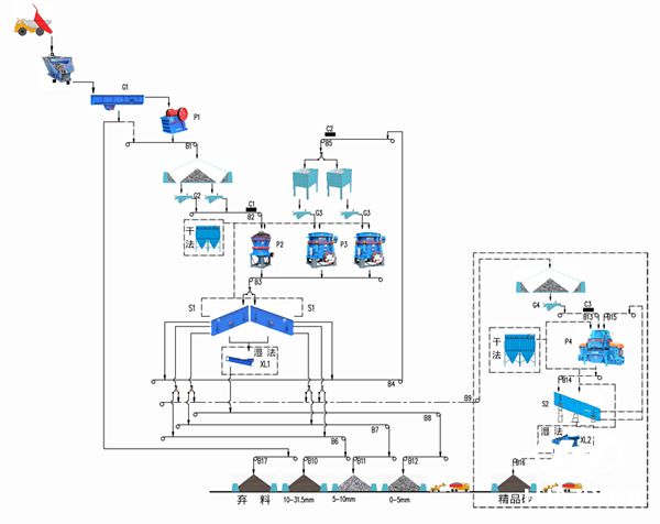振動給料機→JC顎式破碎機→GPY單缸液壓圓錐破碎機→HPY多缸液壓圓錐破碎機→篩分→PLS立式沖擊破碎機→篩分。