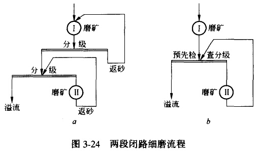 圖3-24a所示為兩段全閉路紉磨分級(jí)流程,適用于磨碎到0.15mm或更細(xì)的要求,其缺點(diǎn)是兩段細(xì)磨負(fù)荷不易均衡地分配。圖3-24b是兩段一閉路細(xì)磨分組流程,其特點(diǎn)是生產(chǎn)能力較大,如果第一段采用棒磨機(jī)可以增大細(xì)磨機(jī)給礦粒度,使破碎流程在開(kāi)路情況下有效地工作,但它只在設(shè)計(jì)大型廠時(shí)才有條件被采用。