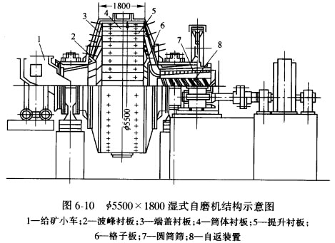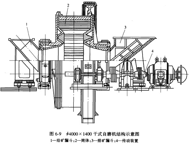 干式自磨機如圖6-9所示。主要由給礦漏斗、筒體、排礦漏斗及傳動裝置、潤滑裝置等組成。 干式自磨機與球磨機比較其結構特點如下: