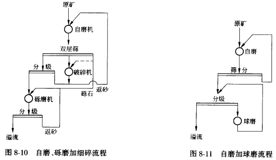 當要求磨礦細度超過70%—200目時,應采用兩段白磨流程。兩段自磨也可分為兩段全自磨和兩段半自磨兩種流程,下面分別介紹。