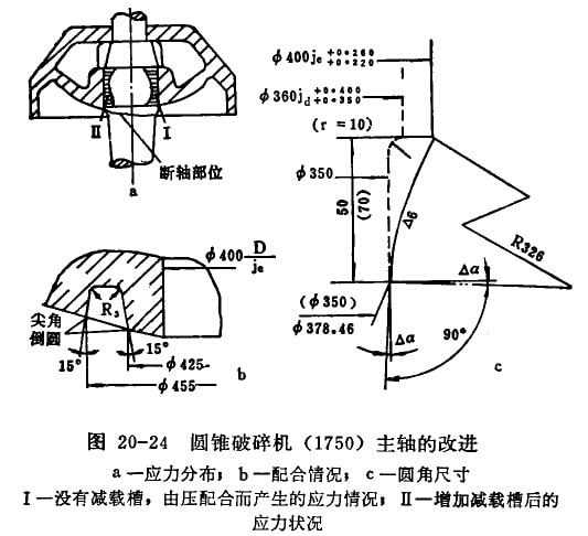 (3)在保證主軸與軀體緊配合,運轉中不發生松動的情況下,減小主軸與圓錐軀體的配合過盈,以適當緩和應力集中。例如舊系列φ1650主軸用D/Jd配合;新系列φ1750破碎機改為D/j配合(圖20-24b)。
