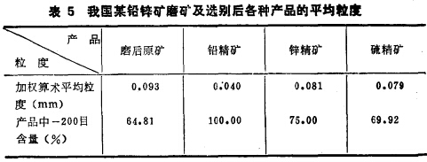 在生產實踐中,產品存在不同礦物粒子粒度差的例子也很多。廣西某沿鋅礦選廠磨礦及選礦產品的篩析計算結果列入表 5。從表l可以看出,硬度愈低的礦物粒度愈細,硬度愈高的礦物 粒度愈粗。蘇聯茲良諾夫斯克選礦廠處理多金屬硫化礦,磨后原礦及各種精礦也存在顯著的粒度差(表6)。