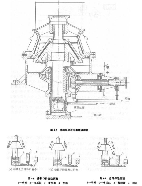 這種破碎機排料口的調整是通過油缸中袖量的增加或減少校動錐上升或下降,從而使排料口減小或增大,如圖4-8所示。