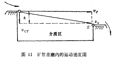 盡管磨機內礦粒沉落情況甚為復雜,但粒度及密度對沉落的影響與分級過程還是相似的。在υp及υcr作用下,礦粒將按合成速度υ0方向運動(見圖11示)。如果合速度υ0的軌跡在磨機排礦軸頸下邊緣點E以上,這時礦粒不進入機下部的介質區而是直接排出磨機外;反之如果合速度化的軌跡在E點以下,這時礦粒將入介介質區。磨機內磨礦作用最強的是磨機下部的底腳區。由公式(23) 看出,粗粒級及大密度礦粒將進入磨礦作用最強的下部底腳區經受磨碎。