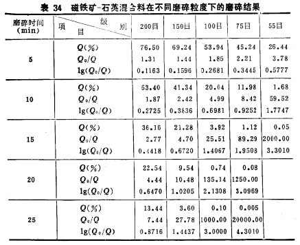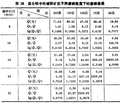 表34及圖13的結果說明,由純礦物組成的碎散混合礦物與純礦構成實際礦石相同,它們在磨碎過程中均遵循一線密礦動力學規律。