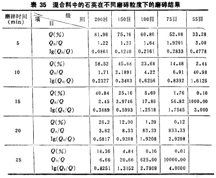 式中β'石英在混合料中的含量。按公式(25)所得的計算值和混合料磨細后粗級別產率的試驗值進行比較,結果相符。據此認為,混合料中每一組分的磨細枏互無影響。