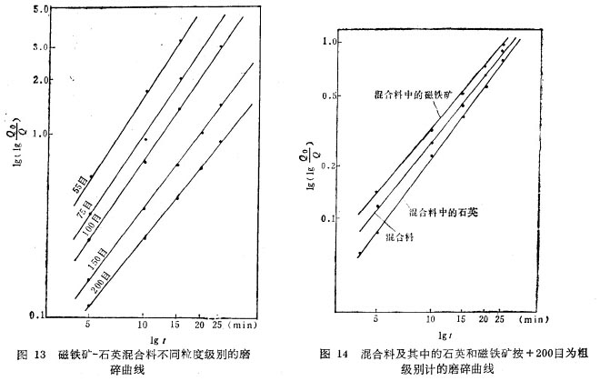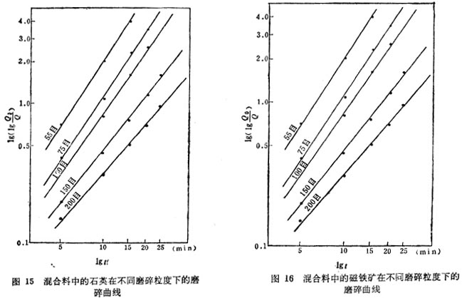 由圖14的曲線可以看出,混合礦物的磨碎曲線似乎是組成混合礦料的兩種礦物磨碎曲線的加杈平均值,混合料的m值及k值也 介于兩種單礦物的m及k值之間。