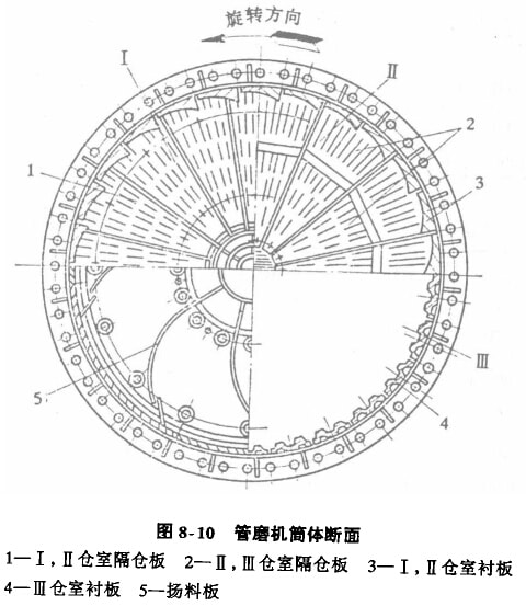 圖8-10是管磨機(jī)筒體的斷面。為了達(dá)到粉磨要求,對(duì)各倉(cāng)室的襯板形式也應(yīng)進(jìn)行適當(dāng)?shù)倪x擇。一般在Ⅰ,Ⅱ倉(cāng)室中,鋪設(shè)階梯形襯板3;在Ⅲ倉(cāng)室中,鋪設(shè)波形襯板4。