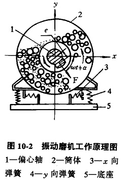 單筒慣性式振動磨機的構造如圖10-1所示。筒體l內裝有粉磨介質及物料,筒體支承在機架3廠的彈簧4上。在筒體的中心部沿軸線方向嵌有帶水套的鋼管,冷卻水連續流過水套以冷卻筒體。鋼管就是激振器的外壁,激振器的偏心袖支承在裝在管端的兩個球面滾動軸承上。當激振器由電動機10通過彈性聯軸節5帶動旋轉時,由于慣性離心力的作用,使得支承在彈簧上的筒體產生振動,磨內的介質也跟著振動。在振動頻率低的情況下,介質與介質之間緊密接觸.一層層的按一個方向。‘起運動.彼此之間沒有相互位移。當振動頻率升高時,加速度增大,介質運動激烈,備介質問的空隙擴大,介質在筒體內幾乎呈懸浮狀態,引起介質自轉、拋動及相互沖擊。夾在介質中間的物料受到沖擊和磨剝作用而粉碎。為了減少傳給基礎的動載荷,在機座8和機架3之間安有減振器9,筒體上設有給料口11,下部沒有排料口12。振動磨根據需要,可以干磨也可以濕磨,可以間歇作業,也可以連續作業。當連續磨料時,與分級裝置組成閉路循環作業。圖10-2所示為振動磨工作原理圖。