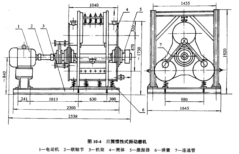 三筒慣性式振動磨機的構造如圖10-4所示。它由電機1、聯軸節2、機架3、筒體4、激振器5、彈簧6相連通管7等部分組成。振動磨機的筒體由三個圓筒和兩塊側板構成,通過兩側板將較大的上圓筒φ400 xl040和較小的兩個下圓筒φ320 xl040串聯在一起,而兩個下圓筒彼此互成并聯,各圓筒內壁上均鈕有襯板,以防筒壁磨損。激振器主要由偏心軸、可調式偏心塊、鑄鋼軸承座、雙列調心滾子軸承和迷宮式密封環等組成。電機1通過彈性聯軸節2帶動激振器5的偏心軸及安裝在軸兩側的偏心塊旋轉,產生離心力,從而使坐落在彈簧上的筒體產生高頻小幅振動。物料和水不斷地從上圓筒的給料口加入,物料在筒內粉磨介質的頻繁沖擊和研磨作用下被磨細,完成第一段粉磨,而后經過排料連通管分別流入下部兩個小圓筒內進行第二段粉磨,粉磨好的合格產品從小圓筒的排料口排出。整個粉磨作業為連續作業。