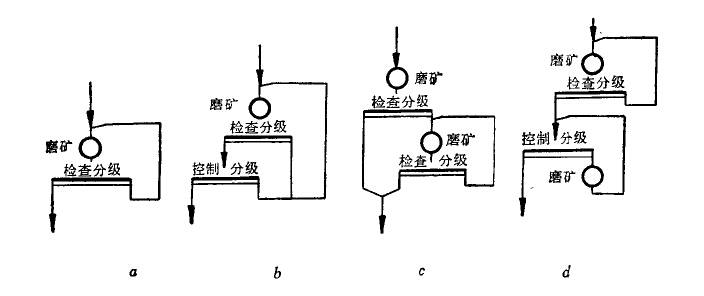由于磨礦機有較大的破碎比,一般磨礦細度大于0.15毫米時采用一段磨礦;小于0.15毫米時采用兩段磨礦。磨礦作業可以分為開路 及與分級設備構戊閉路兩種型式。開路磨礦易造成物科的過粉碎,故僅用在以棒磨機代替細碎的情況下或物料泥化時對選別效果沒有影 響才采用,一般均與分級設備構成閉路。分級設備一般在粗磨時常采螺旋分級機,細磨時采用螺旋分級機或水力旋流器與磨礦機構成閉 路循環。