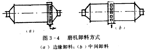 中心卸料式磨機(jī)可分為溢流型(不帶卸料篦板)磨機(jī),如圖3-3b所示,格子型(帶卸料籃板)磨機(jī),如圖3-3c所示。另外有邊緣卸料式磨機(jī)。如圖3-4a所示,磨細(xì)的物料通過(guò)卸料篦板,被輻射狀布置的揚(yáng)料板帶起,然后經(jīng)筒體出料孔卸出。中間卸料式磨機(jī),如圖3-4b所示,這種磨機(jī)是兩端進(jìn)料,中間卸料,在筒體中部的周壁上開(kāi)孔以卸料,相當(dāng)于兩臺(tái)邊緣卸料磨機(jī)的合成。