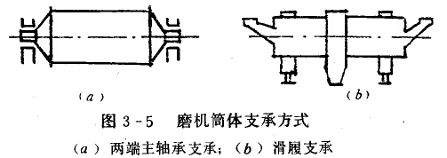 球磨機(jī)筒體兩端的中空軸支承在主軸承上,如圖3-5a所示,這種支承方式比較普遍。另一種為滑履支承磨機(jī),它是通過(guò)緊固在磨筒體上的輪帶支承在治履上運(yùn)轉(zhuǎn),如圖3-5b所示。
