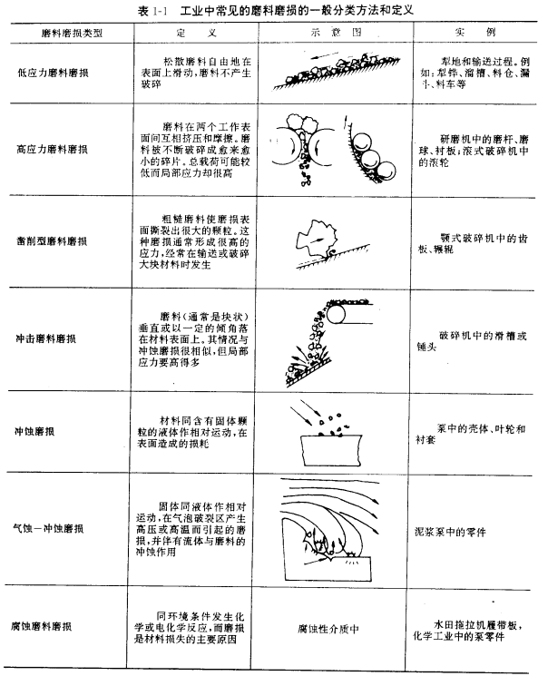 由粗糙硬表面把較軋的工作表面劃傷,或者工作表面受外界硬粒劃傷,都用于磨料磨損。在礦山機械、工程機械、農業機械等行業戶與泥沙、礦石或灰渣等立按摩擦。都會發生不同形式的磨料磨損。據統計,因磨料磨損而造成的損失占整個工業范圍磨損損失的50%。對磨料磨損的分類很多文獻都習慣引用Avery和Rigney的分類法(見表1-1)。