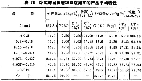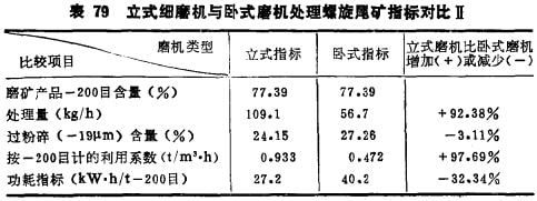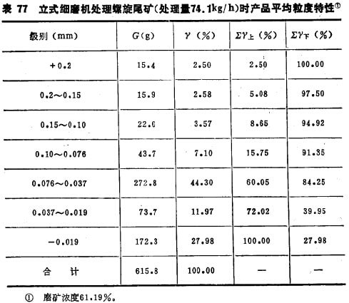 為了說明立式磨的工作特性,在容積相同的臥式及立式磨機中用某公司的老尾礦進(jìn)行了磨碎對比試驗,老尾礦試料用螺旋溜槽選分為精礦及尾礦兩部分,精礦含鐵礦物較多,比較難磨,密度較大,尾礦的密度較小,比較好磨一些。用可磨性不同的兩份試料驗證立式磨的工作性能,試驗用的立式磨及臥式磨的結(jié)構(gòu)及工作參數(shù)見表72示。表73及74中分別列出臥式磨及立式磨磨碎螺旋精礦的產(chǎn)品特性,表75列出臥式與立式磨磨碎螺旋精礦的磨礦指標(biāo)對比。表76及77分別列出臥式及立式磨磨碎螺旋尾礦的產(chǎn)品特性,表78及79分別列出臥式及立式磨在不同磨礦細(xì)度下磨碎螺 旋尾礦的指標(biāo)對比。
