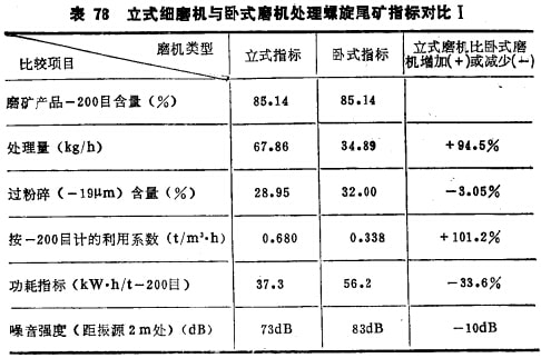 表72~79的試驗結(jié)果說明:立式磨是一種髙效的細(xì)磨設(shè)備, 在產(chǎn)品細(xì)度相同的情況下,處理量比同容積的臥式磨約高一倍, 利用系數(shù)也約高一倍,粒級過粉碎可減少3%左右,按成品計的 功耗降低30~40%,噪音降低達(dá)10dB。