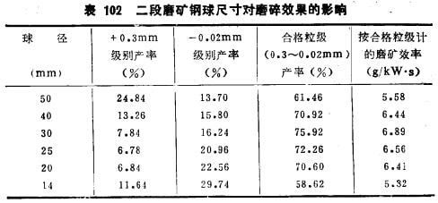 例如,用云錫公司卡房采選廠二段磨礦及三段磨礦給礦,通過(guò)試驗(yàn)方法確定它們的最適宜球徑:二段磨給曠的最大粒度1.2mm,要求的磨礦粒度0.3mm;三段磨給礦最大粒度0.7mm, 規(guī)定的磨礦粒度0.15mm;產(chǎn)品中-0.02mm級(jí)別算為過(guò)粉碎級(jí)表102及表103的試驗(yàn)結(jié)果說(shuō)明: