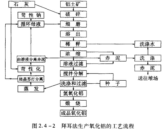 按拜耳法生產lt氧化鋁,需要2.4-4.6t鋁土礦,0.10-0.20t堿,0.12t石灰和300kw·h左右的電能。在生產過程中堿的損失以向送去溶浸的返回濃溶液中加入苛性鈉來補充。