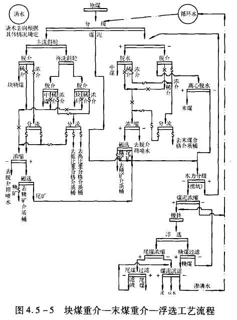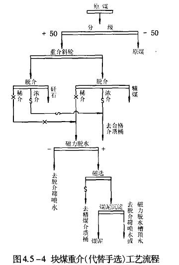 4)塊煤重介(代替手選)工藝流程見圖4.5-4。塊煤含量多的煤,特別是露天開采的原煤,為取消繁重的揀殲作業,有效地提高煤質.并充分回收煤炭資源,常采用這種流程。