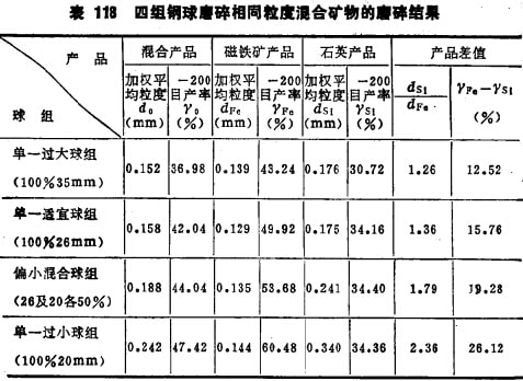 由于2~lmm的石英及磁鐵礦最適宜的球徑均為26mm,故采用100%的26mm的球組為單一最適宜球組;而100%35mm的球組為單一過大球組;100%20mm球組為單一過小球組,采用 26mm及20mm各占50%的混合球組為偏小配合的球組。四組鋼球的重量相同,磨礦條件相同,僅只球徑不同。對四組鋼球分別進行磨碎試驗,并將磨碎產品進行選別,求出混合產品及石英與磁鐵礦單一產品的粒度特性,試驗結果列于表118。