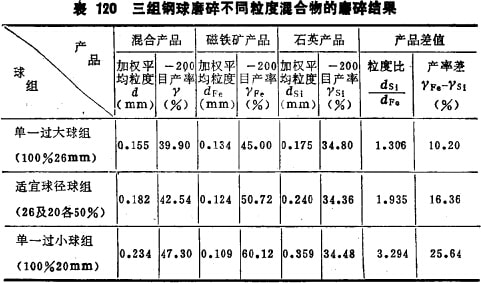 根據此不同粒度礦物混合物的粒度組成情況(即50%2~1mm石英及50%1~0.5mm磁鐵礦的混合物),最適宜球徑的配比應該是26mm及20mm鋼球各占50%; 26mm球為100%時則為過大球組;20mm球占100%時則為過小球組。三組球的球荷重量及磨礦條件均相同,三組球的磨碎結果列于表120。