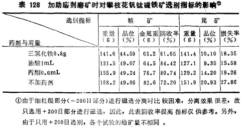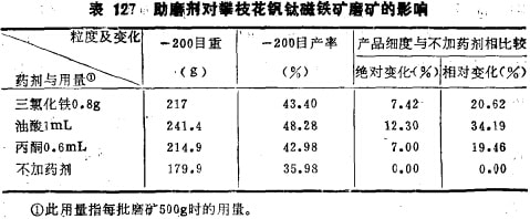 昆明工學(xué)院劉升明在用純礦物混合物進(jìn)行選擇性磨礦研究的基礎(chǔ)上,又進(jìn)一步用實(shí)際鐵礦石進(jìn)行了驗(yàn)證硏究。實(shí)際鐵礦石取自四川塔枝花鐵礦密地選廠的細(xì)碎產(chǎn)品(粒度20-0mm),經(jīng)破碎后取出5~3mm級(jí)別作試料;選擇三氯化鐵、油酸及丙酮為助磨劑;磨礦濃度為65%,磨礦時(shí)間20分鐘。試驗(yàn)結(jié)果表明,三種助磨劑均有顯著助磨效果,加藥與不加藥的磨碎結(jié)果差異顯著,如-200目產(chǎn)率的絕對(duì)變化率增加7~12%,而相對(duì)變化率則增加20-34%,詳見表127所示;磨碎產(chǎn)品進(jìn)行磁選處理,得出精礦及尾礦,結(jié)果見表128所示。表128說明,加助磨劑后選別產(chǎn)品的精礦回收率有顯著提高(這里只考查了+200目部分),而尾礦中的金屬損失率大太降低。這也證明磨礦產(chǎn)生了顯著的選擇性解離,提髙了磨礦產(chǎn)品的單體解離度,所以尾礦中連生體少,金屬損失少,尾礦品位低。