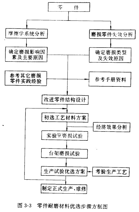 優(yōu)選耐磨材料的基本方法和步驟可參考圖3-3,即根據(jù)零件的實際使用條件,對零件的摩擦學系統(tǒng)進行系統(tǒng)分析,確定影響磨損零件的主要因素,再根據(jù)典型易磨損零件進行失效分橋,以確定磨損的主要類型;參考已有資料和手冊初選材料及工藝,然后做模擬件磨損試驗,篩選出較優(yōu)方案后,再做臺架試驗、實際使用試驗。將試驗結果與原方案比較,反復試驗判斷其效果的再現(xiàn)性,然后估算其耐磨效果祁經濟價值,經技術鑒定再轉入中間或成批試驗。再考核其應用在技術上的可能性和可靠性,最后制訂出制造工藝規(guī)范和安裝維護規(guī)定,才算完結。