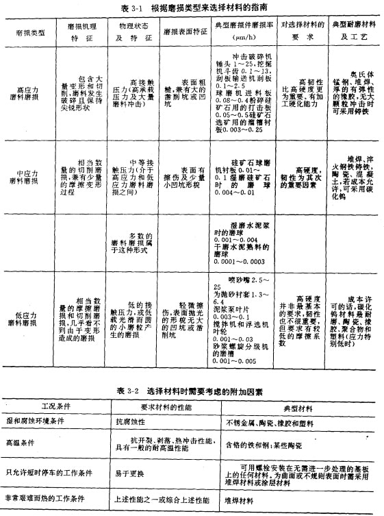 根據(jù)對零件磨損過程的系統(tǒng)分析以及典型零件的失效分析以后.我們對零件湃損原因,影響岡素及磨損類型、選材基本方向有了一定了解,下—步就要根據(jù)現(xiàn)有資料、知識相經驗對材料和工藝進行方案初選。由于問題的復雜性,在材料和工藝選擇上目前還停留在定性和感性認識的基礎上,主要還是靠現(xiàn)有經驗和反復試驗來預測及判斷的。表3-1為根據(jù)磨損類型來選擇材料和工藝的指南,表3-2是選擇材料和工藝時需考慮的附加因素,F(xiàn)今公布的資料尚不足以滿足各個領域對材料和工藝優(yōu)選需要,只是為選擇材料和工藝時提供一些參考。
