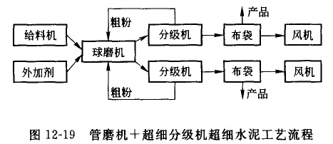 磨機選用一臺改良型管磨機φ1.83m×7m,分級機采用FJDZ-4四轉子大型超細分級機兩臺,順流式布袋收塵器四臺和高壓風機兩臺,組成如圖12-19所示工藝流程。該系統在負壓下操作,無粉塵飛揚。