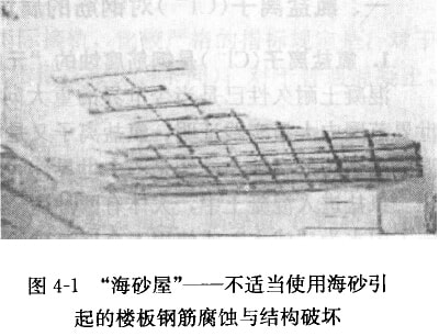 我國大規(guī)模經(jīng)濟建設(shè)的飛速發(fā)展,使沿海地區(qū)陸續(xù)出現(xiàn)河砂短缺現(xiàn)象。我國沿海地區(qū)愉挖、濫用海砂現(xiàn)象出來已久,1999年同土資源部發(fā)布了《關(guān)于加強海砂開采管理的通知》,提出在保護(hù)海洋環(huán)境的前提下,允許有序地開發(fā)海砂資源,以解決建筑用砂問題。這本是“變廢為寶”的好事,然而,不合理地使用海砂,卻會給國家和民眾帶來麻煩乃至災(zāi)難。這是因為海砂中含鹽,會腐蝕鋼筋、破壞混凝土結(jié)構(gòu)。如果使用不合格海砂,建筑物就會發(fā)生結(jié)構(gòu)破壞甚至跨塌(一般可在1-15年內(nèi)暴露出來)。一旦遭遇地震,這樣的建筑物可能最先倒塌。所謂“海砂屋”就是指使用了不合格海砂所建造的建筑物(公用、民用或基礎(chǔ)設(shè)施),是屬于質(zhì)量低劣的建筑(圖4-1)。