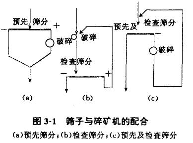 篩分是將礦石按粒度分成二種或多種級別的過程。篩分時,通過篩孔的顆粒稱為篩下產(chǎn)品;未涌過篩孔的顆粒稱為篩上產(chǎn)品。在選礦廠采用的篩分作業(yè)有預先篩分和檢查篩分兩種。預先篩分是礦石進入破碎機前的篩分。其目的是除去粒度已合格的產(chǎn)品,防止物料的過破碎和提高破碎機的生產(chǎn)能力。檢查篩分是礦石經(jīng)破碎后進行的篩分。為了控制破碎產(chǎn)品的粒度,使不合格的產(chǎn)品返回破碎機再破碎,見圖3-1。