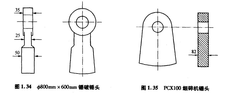 例如,老型號(hào)錘式破碎機(jī)錘頭的結(jié)構(gòu)形狀如圖1.34,立軸式破碎機(jī)錘頭也類(lèi)似。當(dāng)初設(shè)計(jì)思想是盡可能減輕非磨損部位(錘柄)的重量,節(jié)約材料,降低成本。所以,錘柄部位很薄,只有采用高錳鋼或低碳合貧鋼材質(zhì)才能保證其不斷裂,但耐磨性很差,無(wú)法用于熟料的破碎。用高硬度耐磨材料制作該錘頭,很容易斷裂,無(wú)法可靠應(yīng)用。